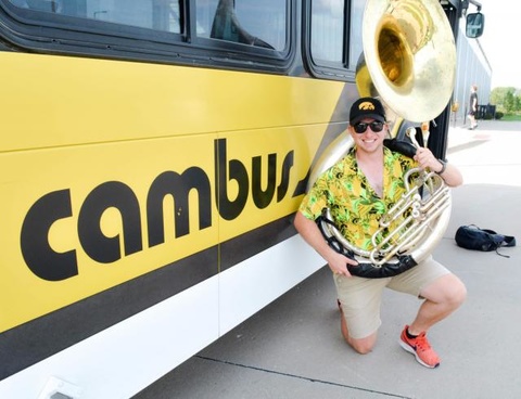 Man kneeing on one knee next to gold bus wearing floral print shirt and black gold Hawkeye hat, holding sousaphone musical instrument